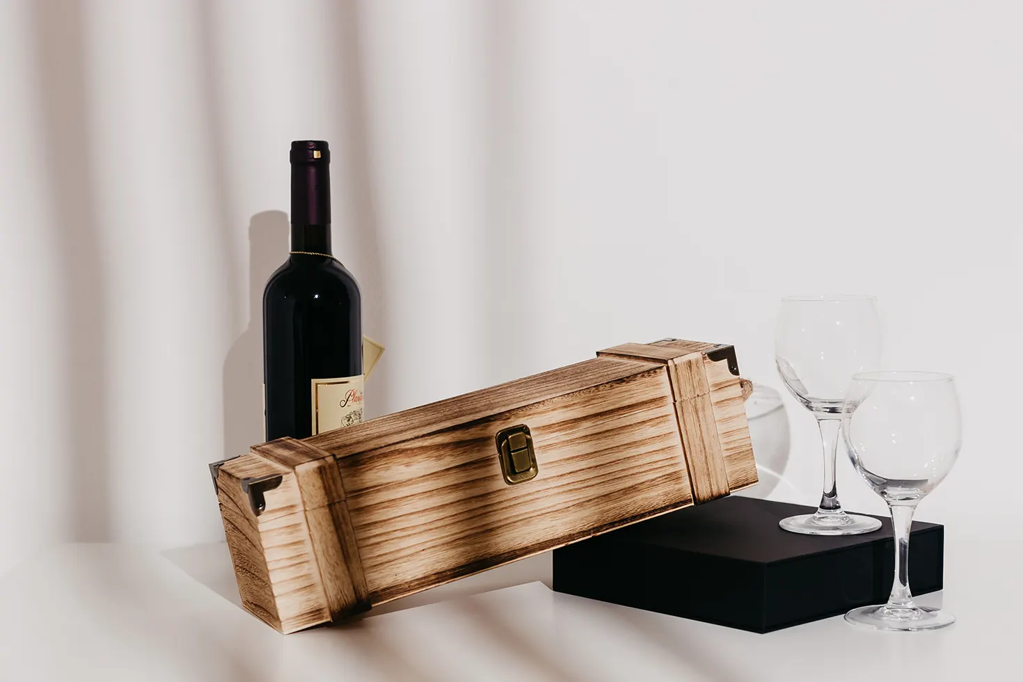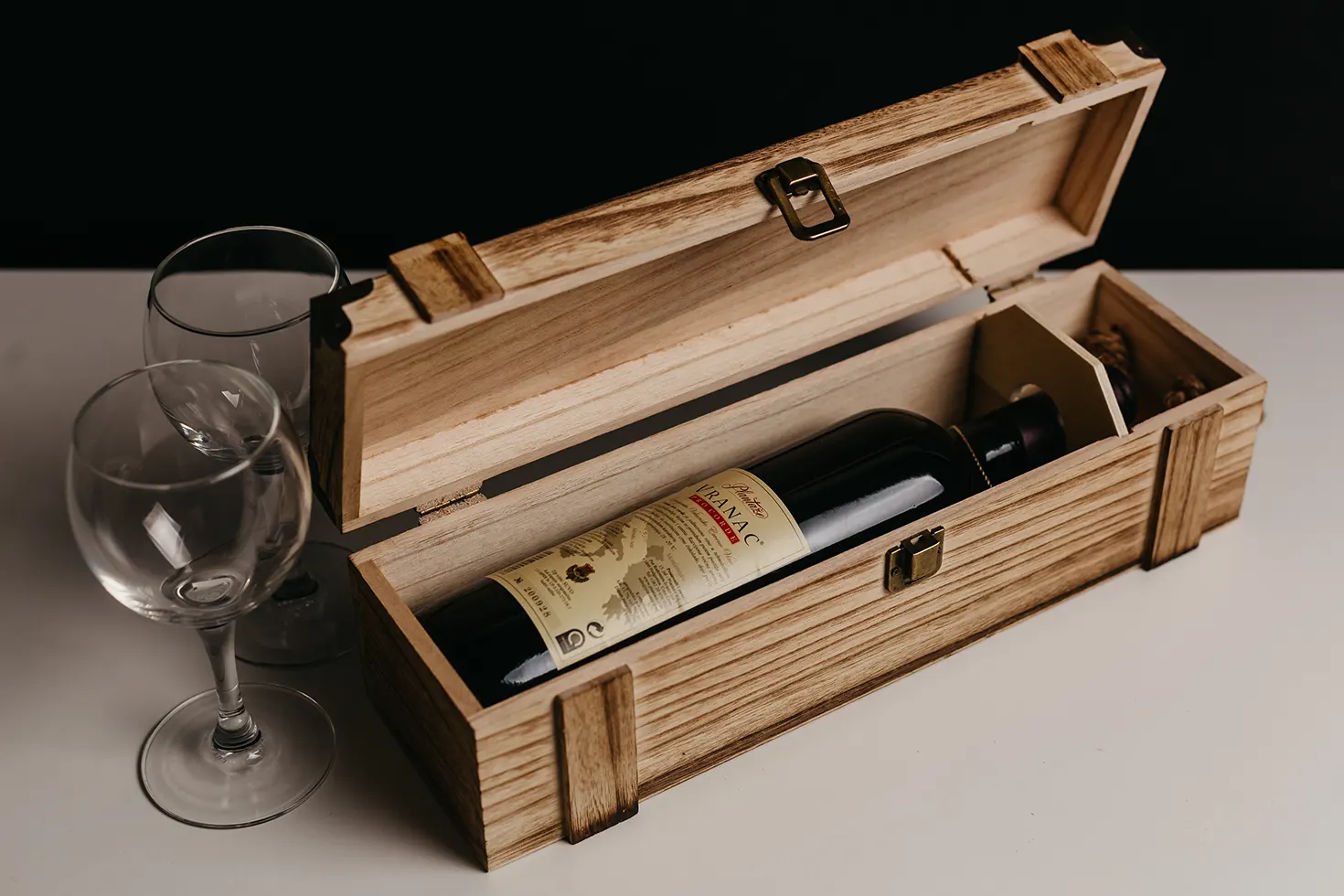 Kuti elegante druri për një shishe vere – zgjedhje ideale për dhuratë biznesi ose evente të veçanta.