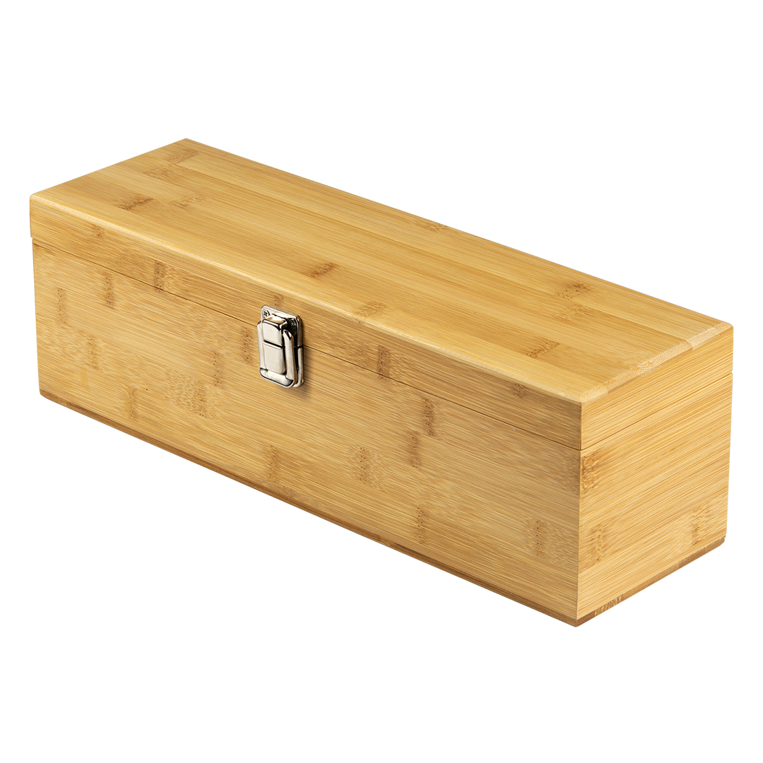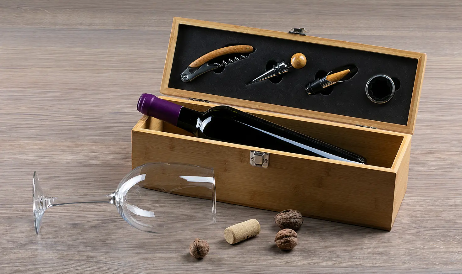 I vendosur në një kuti druri me finiturë natyrale, ky set përmban 4 aksesorë praktikë për hapjen dhe shërbimin e verës.
