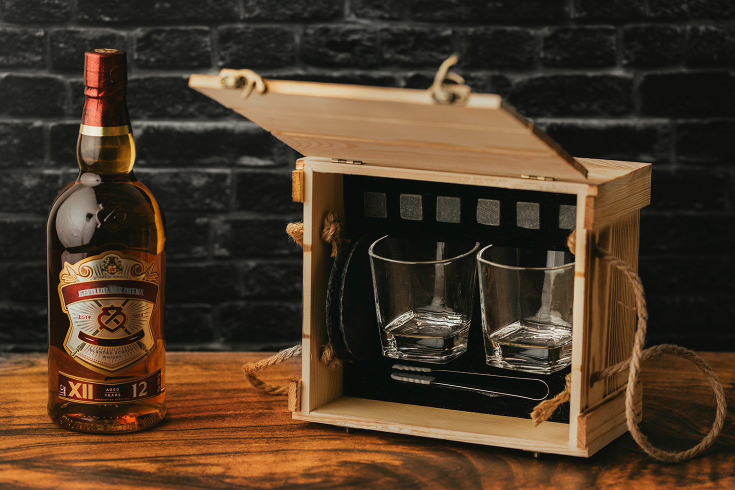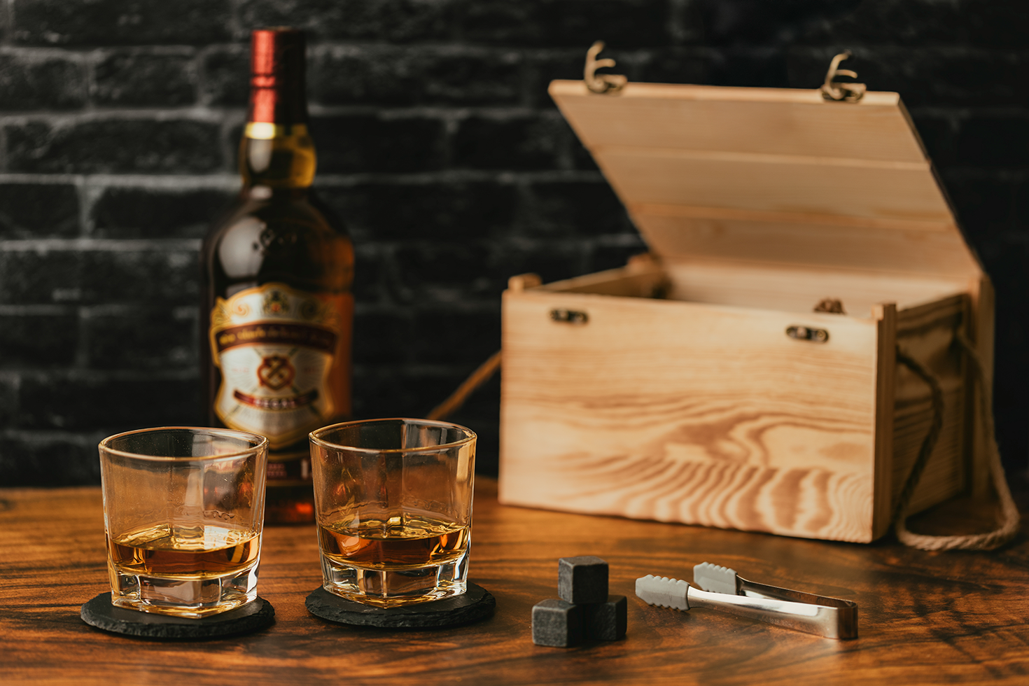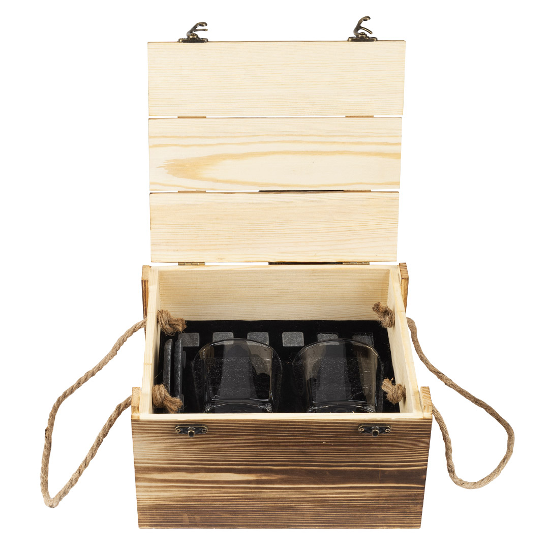 Set elegant në kuti druri – me gota, coaster-guri dhe kube akulli graniti – kombinim i stilit dhe funksionalitetit për një eksperiencë të rafinuar gjatë shijimit të pijeve.
