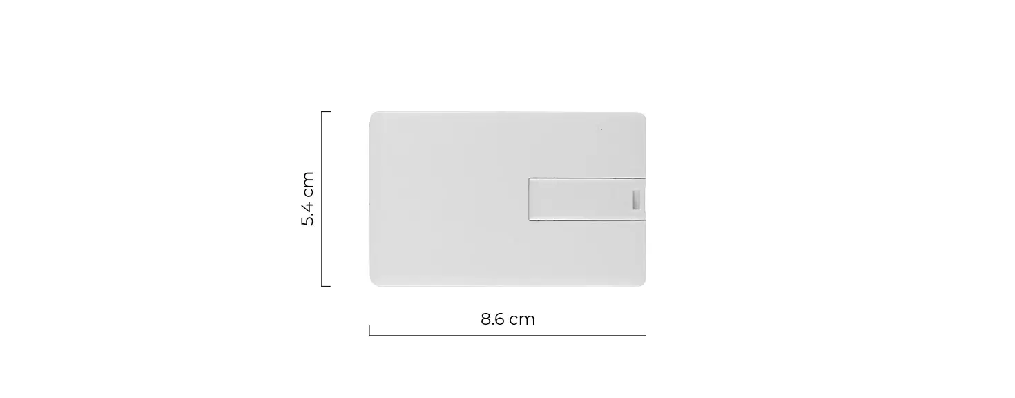 USB praktike e hollë në formë karte, dimensione 8.6 × 5.4 × 0.3 cm, me material plastik për transport dhe përdorim të lehtë.